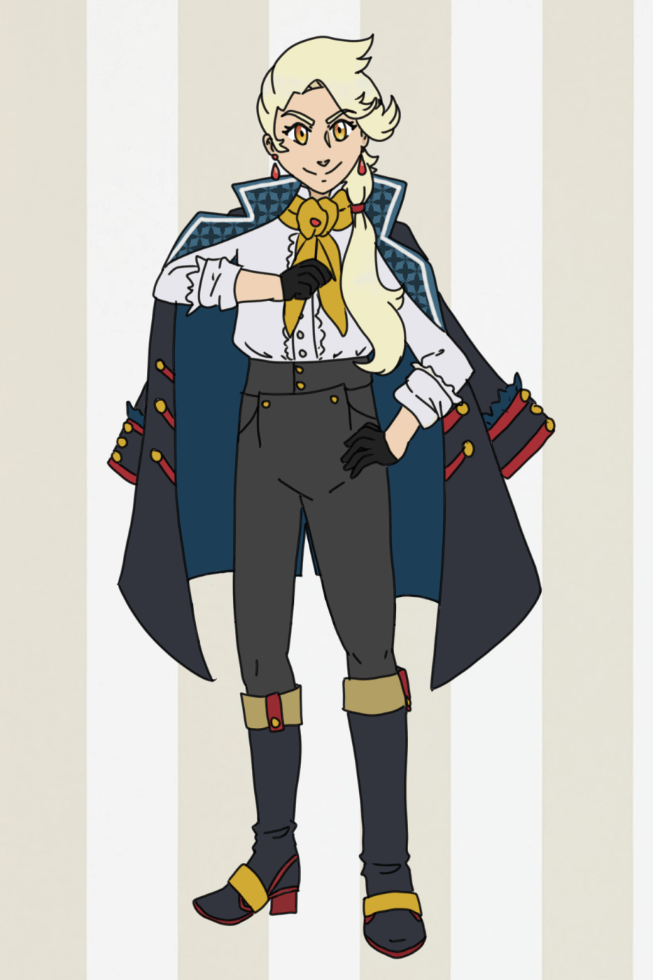 Kyrie is a trainer/coordinator who, though growing up in Michina, starts their journey in Sinnoh, becoming one of Tanith’s main rivals (if not her main one). They quickly make a name for themselves with their flashy style and dramatic personality, and end up becoming something of an idol to Morgan, who goes on to emulate their style when he starts his own coordinator journey. While they like to play the part of a villain, in reality Kyrie is all bark and no bite. They’ll talk big but actually can be quite naive and lacking in common sense sometimes, often to the point of being too trusting or missing the point of things. Nonetheless, they’re certainly fun to be around and know how to liven up any gathering with flair!